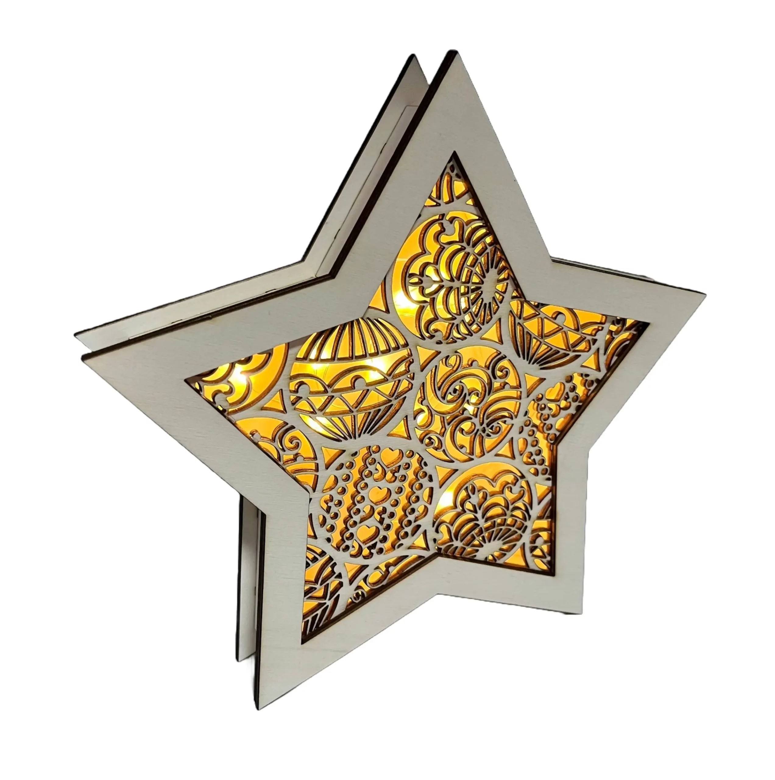 🎨 Provedení: Robustní, vrstvená hvězda z překližky (hloubka cca 3 cm) vytváří působivý prostorový 3D efekt. Uvnitř najdete hustou, pečlivě vyřezanou siluetu ornamentů s motivy vánočních koulí, vlnovek a abstraktních tvarů.