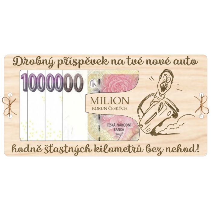 Originální a vtipná dřevěná kartička ve tvaru miliónu s textem „Příspěvek na auto“. Třívrstvý design: zadní plná vrstva, prostřední s výřezem na bankovku a horní vrstva s nápisem. Horní vrstva je přivázaná k ostatním provázkem díky vyřezaným dírkám, což dodává celé kartičce osobitý šmrnc. Perfektní dárek pro čerstvé řidiče nebo pro ty, kdo si šetří na nové auto! 🚗💨