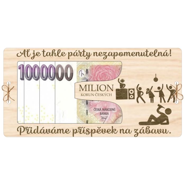 Tato originální dřevěná kartička ve tvaru miliónu je ideálním dárkem pro každého, kdo miluje párty a zábavu. S textem „Ať je takhle párty nezapomenutelná! Přidáváme příspěvek na zábavu.“ Kartička je třívrstvá – spodní plná vrstva, druhá s výřezem na bankovku a třetí vrstva s dekoracemi diskotéky, DJ a alkoholu. Vrstvy jsou svázané provázkem, což vytváří zajímavý vzhled. 🎧🥂