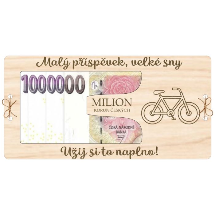 Originální dřevěná kartička ve tvaru miliónu s nápisem „Malý příspěvek, velké sny. Užíj si to naplno!“ a obrázkem kola. Třívrstvý design: spodní plná vrstva, prostřední s výřezem na bankovku a horní s dekorativním nápisem. Vrstvy jsou pevně spojené provázkem skrz vyřezané dírky. Perfektní dárek pro milovníky cyklistiky a sportu! 🚲