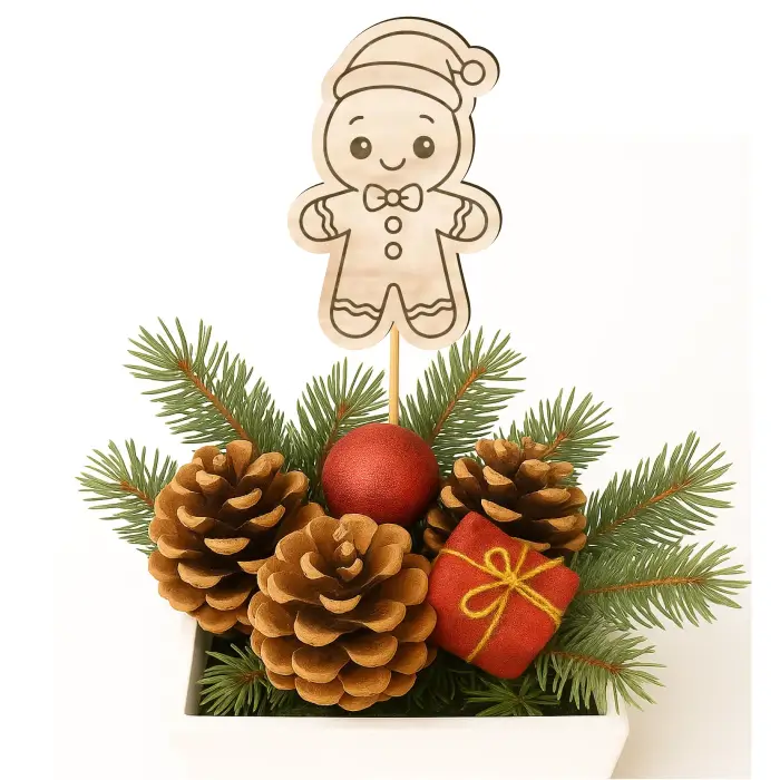 🪵 Ruční práce a poctivá překližka – detailně propracovaný perníček s veselými detaily, včetně typické cukrové polevy a zimní čepice. Je perfektní do květináčů, vánočních truhlíků nebo jako sladká tečka v jakémkoli adventním aranžmá.