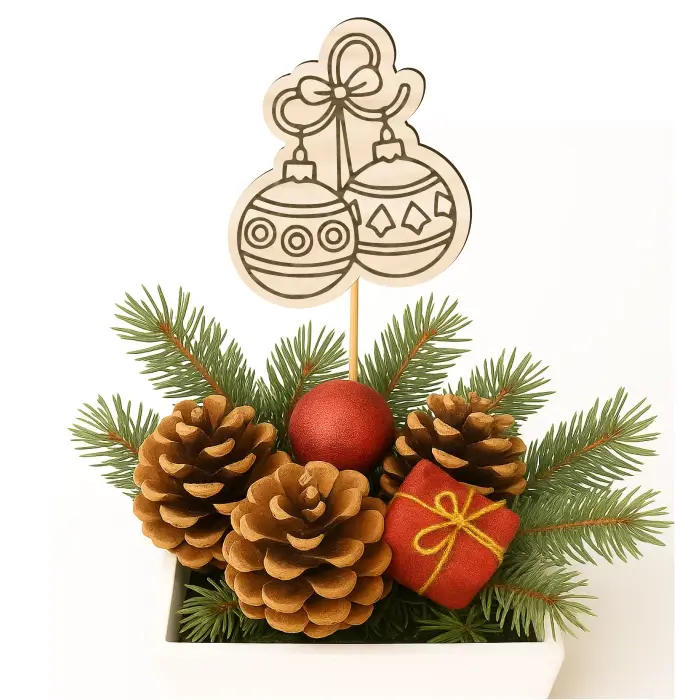🪵 Pečlivě zpracovaný zápich z kvalitní překližky, který zachycuje několik baněk s různými vzory. Je ideální jako barevný a veselý prvek do truhlíků, květináčů, nebo ho můžete použít k dozdobení větších vánočních aranžmá. Tento kousek prostě rozzáří každé místo.