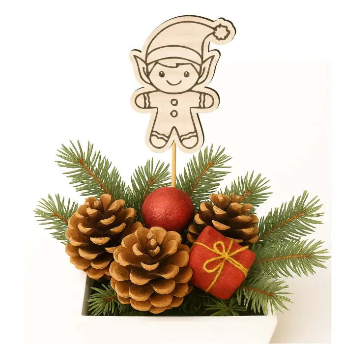Hravý pomocník Santy! Náš dřevěný zápich Vánoční elf přináší hravost a veselou náladu přímo do vašeho aranžmá. Tento populární skřítek ze Severního pólu evokuje radostné přípravy na svátky a je skvělým doplňkem pro rodiny, které milují moderní vánoční tradice.